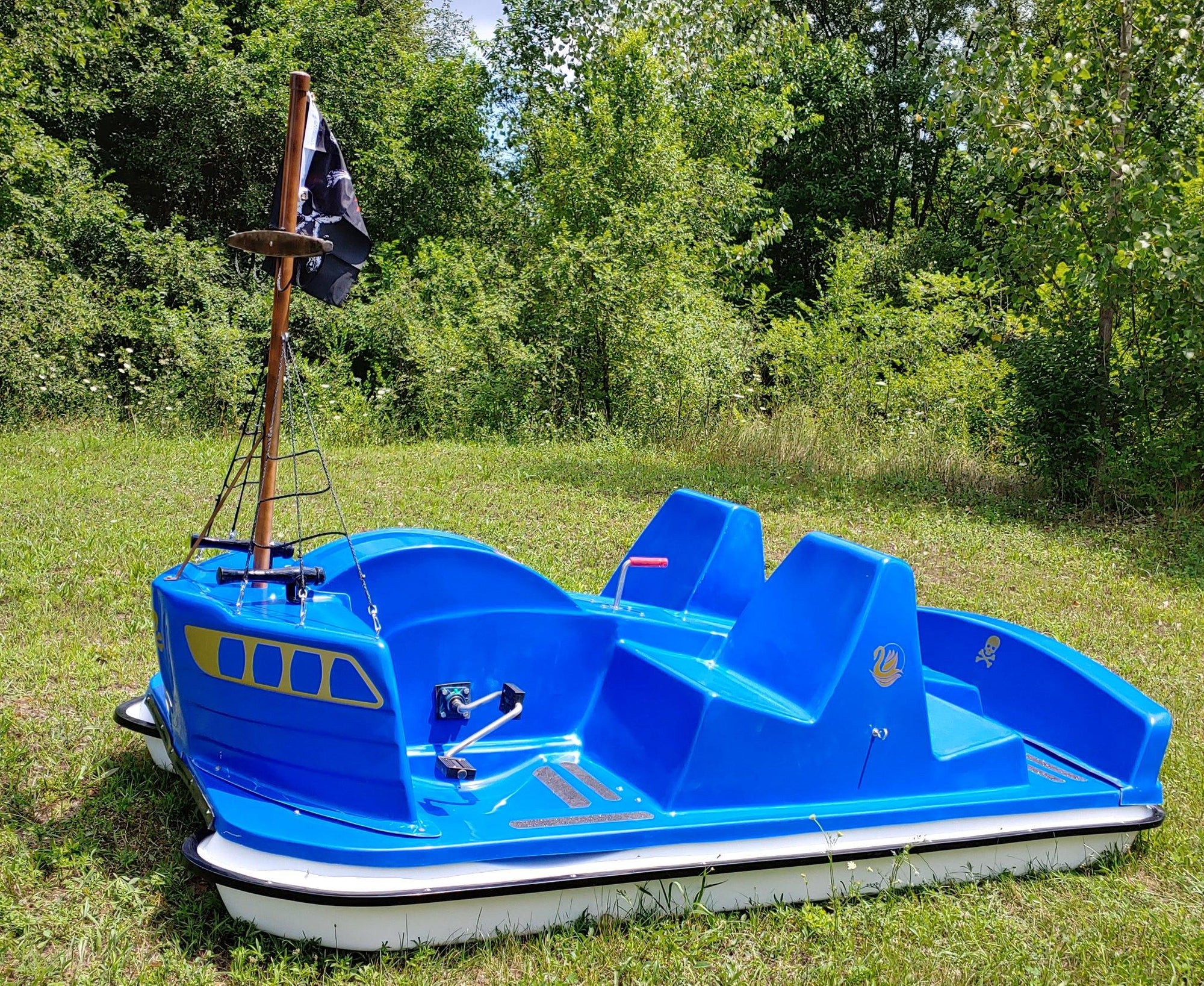 Release your pirates aboard the Adventure Glass Pirate Ship Platform Pedal Boat. Young and old alike will scour the seas for bounty and a great time!
