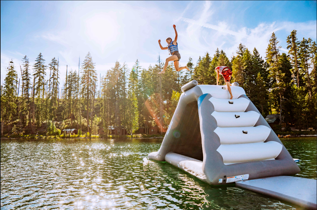 This Aquaglide Lakefront Velocity 10.0 Slide will take your breath away. This 10' slide features a ladder-style climbing wall that leads to a ten-foot-high drop-zone! Slide Or Jump! You Choose!