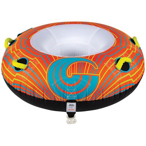 Single rider, fully covered round tube has a 420D nylon cover, fully enclosed, durable heavy-duty PVC bladder with radio frequency (RF) welded seams. 4 padded handles with knuckle guards for added safety and comfort. Boston valve for easy inflation, and quick connect tube rope attachment. Covered mesh bottom drains excess water. Semi-cockpit designed towable tube comes complete with a peel and stick repair kit. This 1-person inflatable has a maximum, weight capacity of 170 lbs (77kg), requires a tow rope with a tensile strength of 1,500 lbs (682kg) that is 50' to 65' (15.25m to 19.8m) in length.
