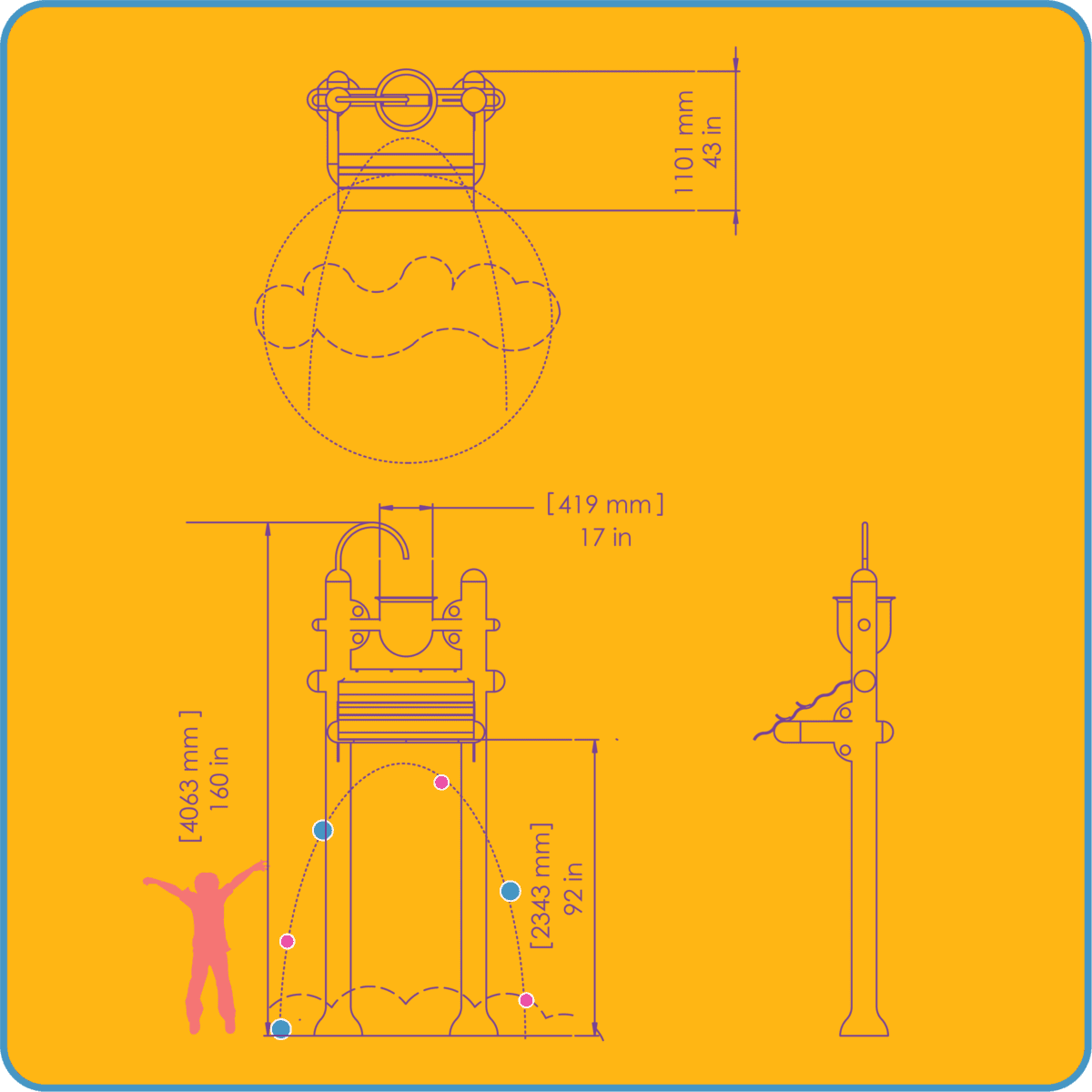 The Aquadunker is slimmed down version of Empex's stand-alone K024 structure which has less water consumption, with a tipping cauldron that can be safely installed in Spraypark installations with no standing water or in shallow pools up to 3’ (1m) depth. The bucket shall dispense its complete volume onto a roof suitably designed and contoured to reduce the force of the water and disperse a safe spray in a 180 degree radius. The roof shall be structurally designed and supported at the columns to withstand the force of the water.
