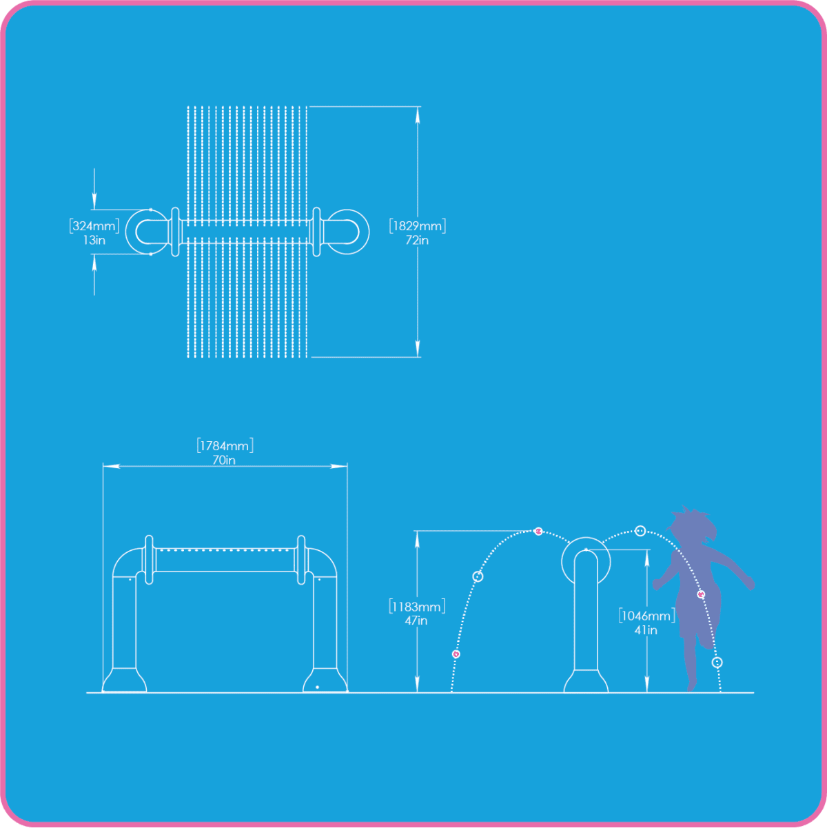 The structure creates an interesting presentation for the water flow in the form of two lines of laminar jets emitted from both sides. As one jet is stopped by the hand, the others increase in size, this unit is excellent to create a low water effect for interaction of parents and children alike.