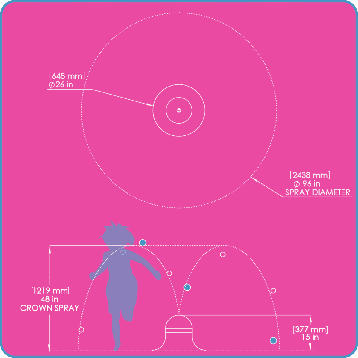 The unit is a low level unit suited for the smaller children who enjoy playing with the soft fan spray which is emitted from a central port on the dome. As the hand covers one nozzle the others increase in height. The players will gather friends to see if they can cover as many nozzles as possible to create a geyser.