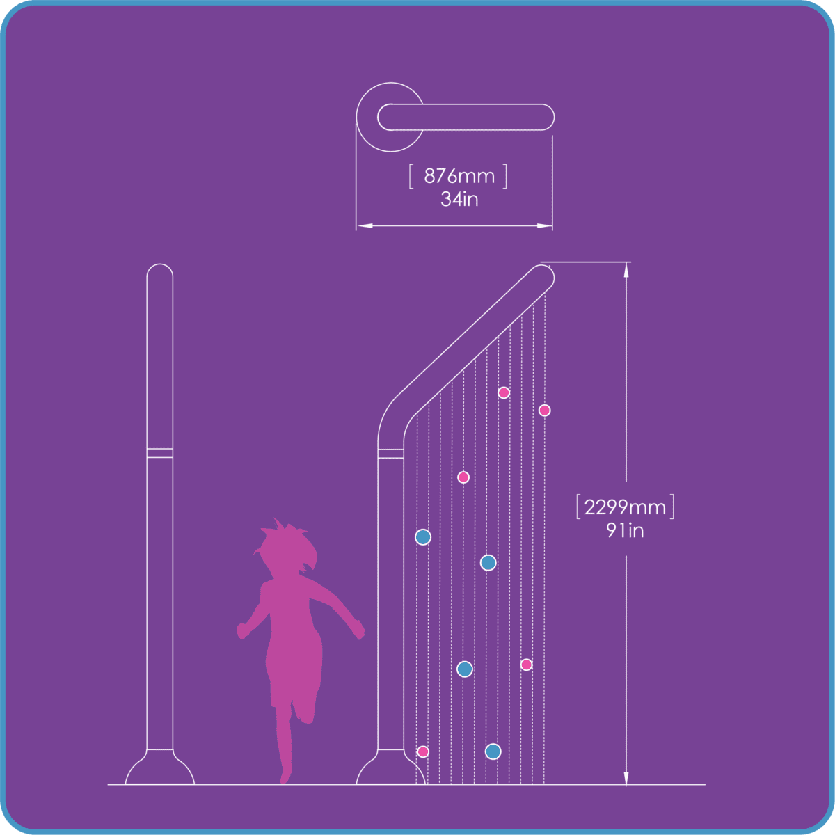 Created in the shape of an upside down ‘ L’, the structure creates an interesting presentation of water flow in the form of multiple soft laminar jets forming a water curtain from above. This unit is excellent to create a high water effect for interaction of parents and children alike.