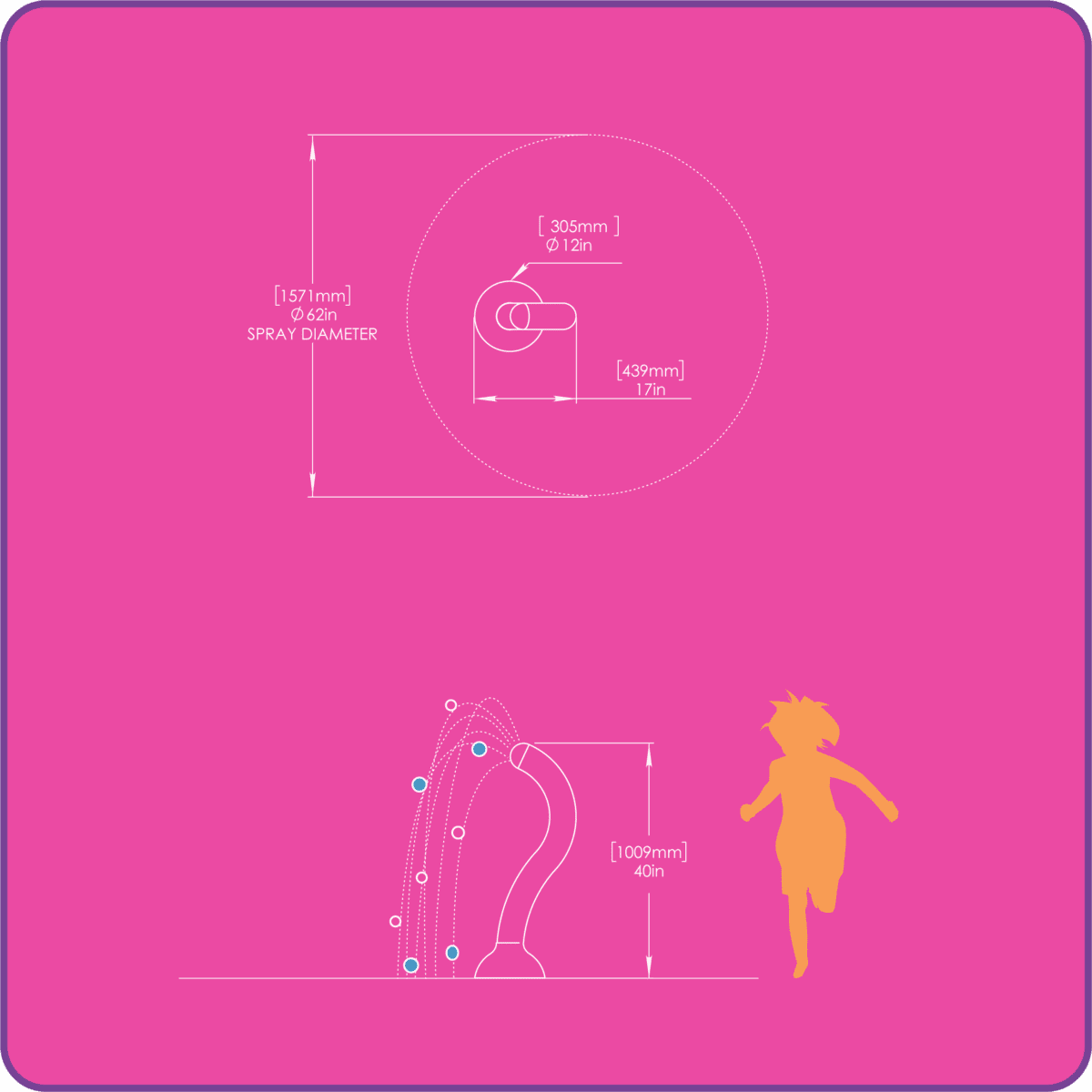 The Aquawigl Mini is an interactive spray structure which must be installed on a level area and is suitable for installation in a spray park without standing water or in a non-beach entry shallow pools with a maximum 15” (38cm) of water. A piped in water source is required.