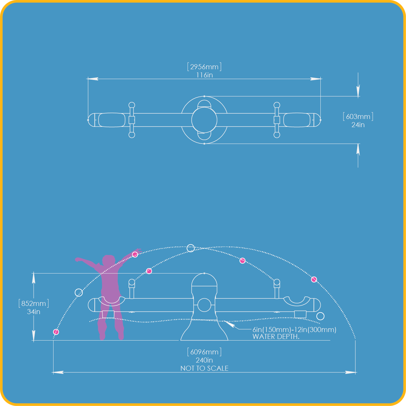 The Watertotter is an aquatic teeter-totter suitable for installation in shallow pools with depths of 6” (15cm) to 12” (30cm) of water. The unit contains its pump and draws water directly from the pool, eliminating the need for a piped-in water source.