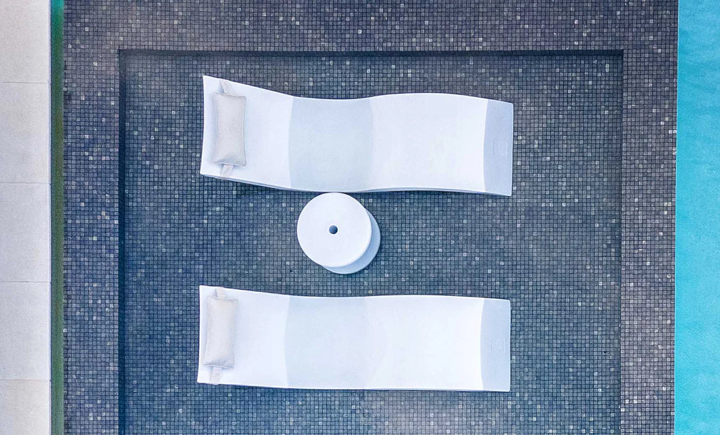 Balanced and modern, the hourglass shape accommodates surrounding chaises or chairs with a seamless flattop surface.