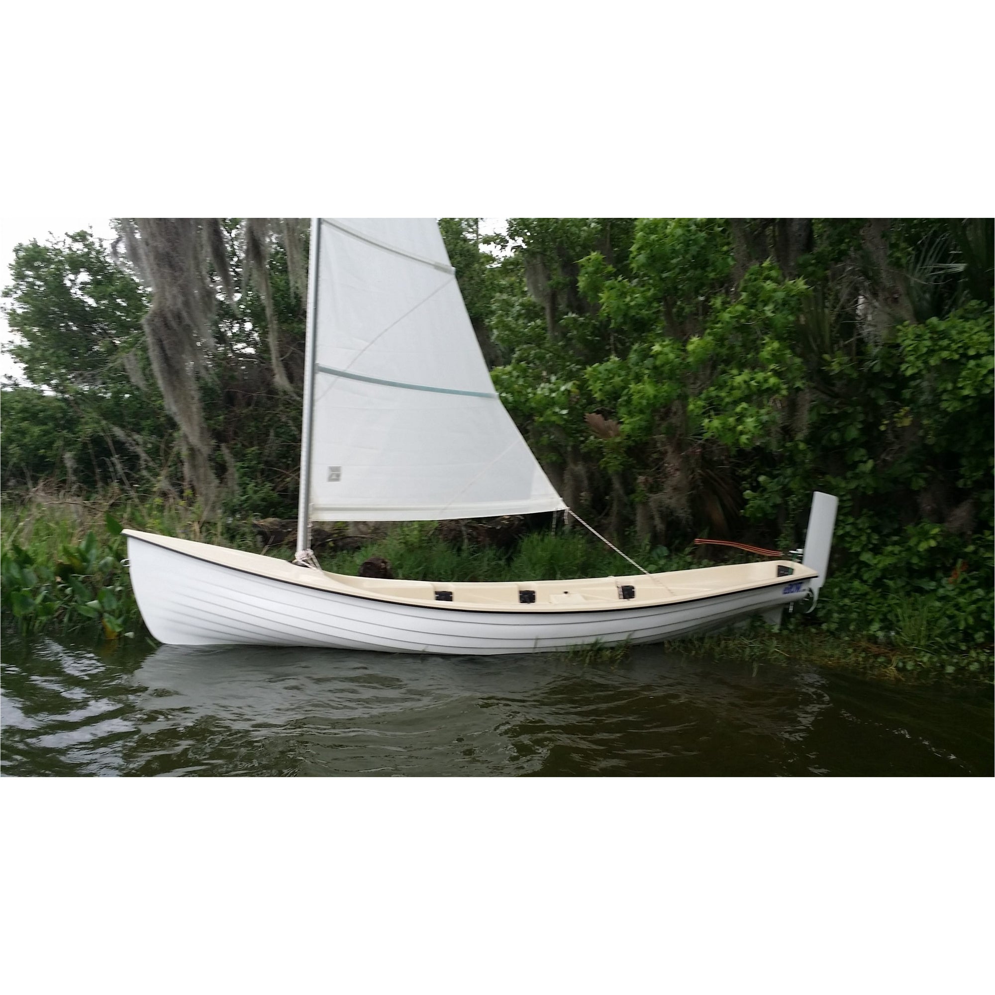 She has higher sides than a Heritage, and a wide rolled topside gunnel for comfortable sitting when hiking out. The sail package (Optional) is a wonderfully simple Boom-less Marconi rig. She utilizes a light, pick-up daggerboard in a centered trunk, and a European- designed kick-up rudder. You can row out and sail back, and set up at sea. The mast is 2-part, stay-less, and can be stored onboard even while rowing. The sail is Raid and Everglades Challenge approved, with quick up and down setting and reefing points.