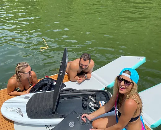 No more worries about how to change out batteries while out on the water. ParadisePad Hydrofoil Docking Station keeps the efoil in the water & not on your boat.