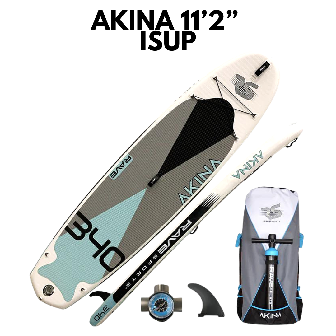 Extra wide for better balance. "Akina" is Ojibwe for "everything," so the new Akina 340 inflatable paddle board is the durable, portable, and storage iSUP for everyone and every SUP experience. With a wide and long non-slip deck pad, the Akina is a great option for all skill levels and paddling fun including taking along kids and dogs. Includes an easy fin system, cargo cords and versatile attachment points, reinforced nose and center handles, a backpack-style carry bag and a speedy dual action hand pump.