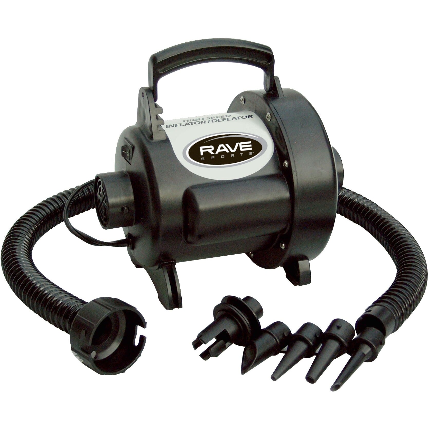 Smart 12V electric inflator / deflator with LCD pressure monitor to inflate your RAVE Sports iSUP, Aqua Mat™, or Aqua Dock™ in minutes.
