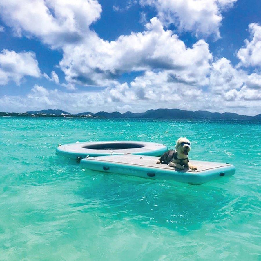 Inflatable 10' x 10' x 8" circular dock with a mesh center. Utilize 24" of dock surround to relax, sunbathe, and hang out.