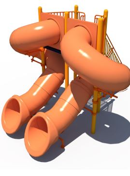 Double flume half hex deck poolside slide features two 360° enclosed slide flumes, half hex deck, and center steps with rails.