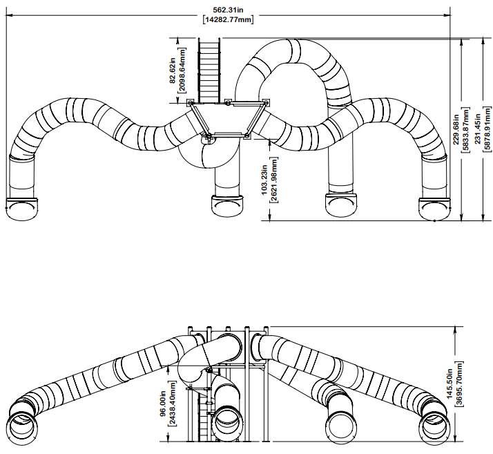 Quad flume half hex deck poolside slide features four enclosed slide flumes with varying degrees of turns, half hex deck, and center steps with rails.