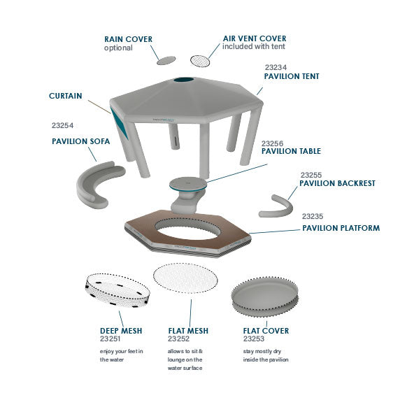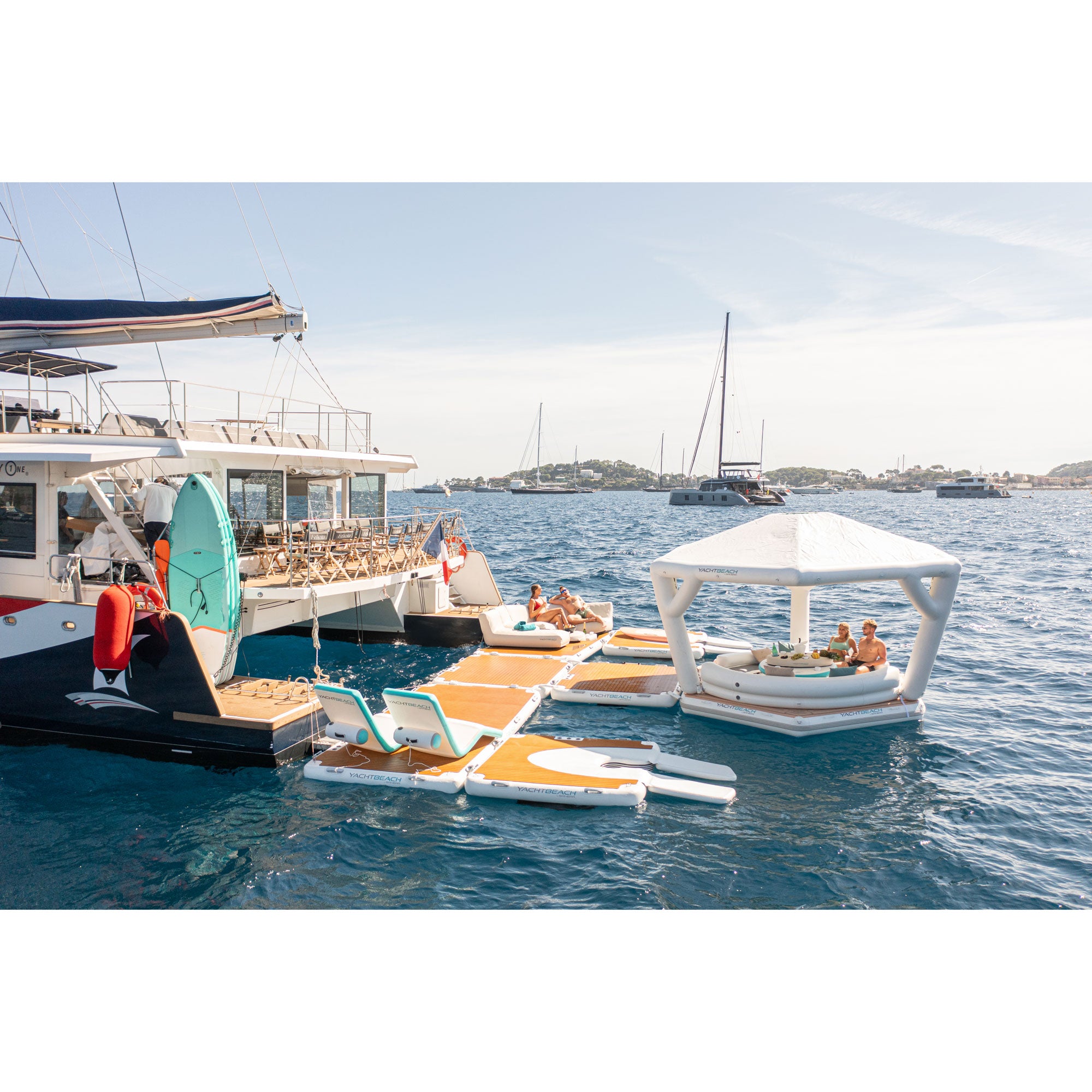 Yachtbeach Pavilion Platform 4.10 floating mesh floor can be removed and replaced with an 86.6" mesh to convert the party zone to a party pool.